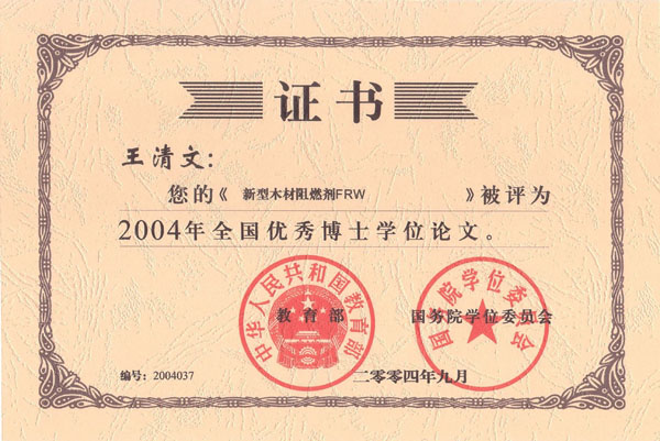 新型木材阻燃剂FRW是东北林业大学在承担国家“948”项目的过程中,经过近四年的理论与实验研究和中试生产,开发成功的一种性能更加优越、生产技术更为先进、具有自主知识产权的新型木材阻燃剂,通过系统的产品质量检验及应用性能评价,形成了配套的生产和应用技术。经黑龙江省科技厅鉴定,处于国际领先水平。