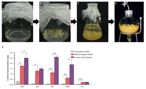 (A)人参不定根的固体培养;(B)固体培养1个月后的人参不定根;(C)人参不定根的液体培养;(D)人参不定根的生物反应器培养;(E)人参不定根与5年生人参中主要人参皂苷的比较。