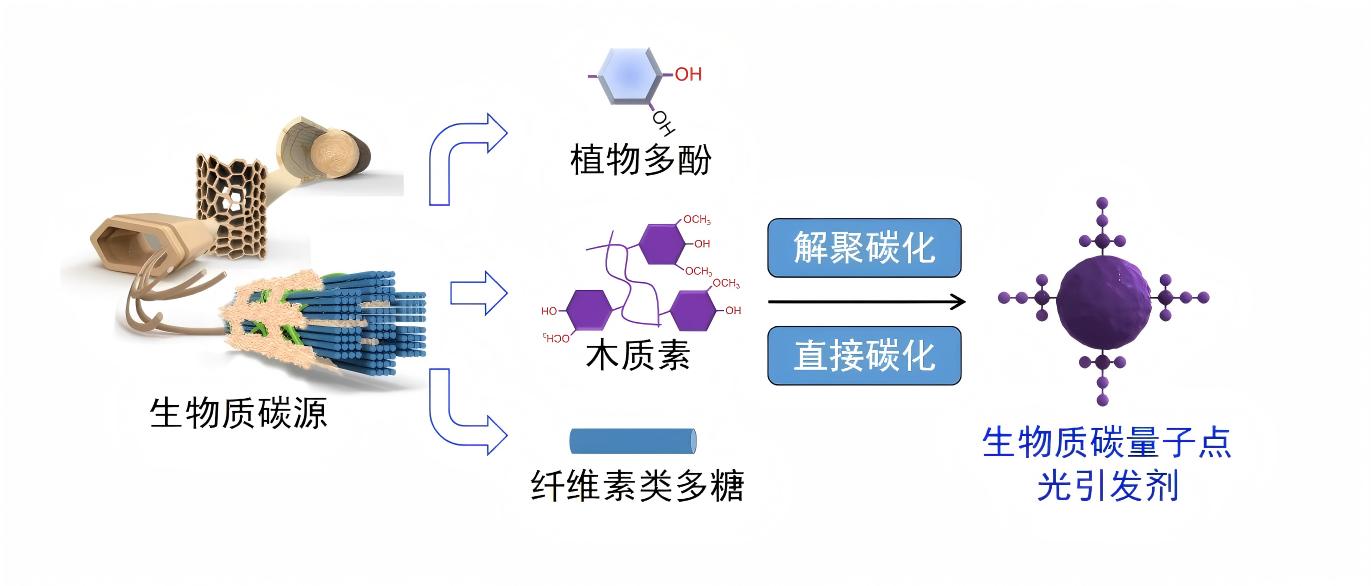 光敏引发剂作为光固化材料中的关键组分,它对光固化材料的光固化速度起决定性作用。在前期研发的基础上,团队从林业生物质资源出发,开发出世界首例生物质基碳量子点型光引发剂,该类光引发剂引发效能可媲美传统分子型引发剂,且具有低迁移率与生物毒性低等系列优势。该产品已经完成实验室级制备、性能测试、工厂实验室测试,目前正处于与国家第二批重点专精特新“小巨人”、新三板上市企业进行共同研发与推进产业化阶段。