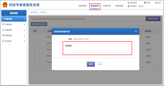 专家用户登录专家库,点击【事务管理】-点击【添加变更申请】,填写变更原因-点击【保存】,完成退回,可继续进行信息修改。