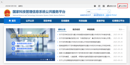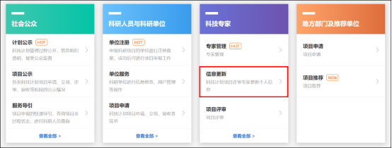 方法1:专家用户登录公共服务平台,点击右上角【登录/注册】,输入登录账号及密码(注:此处不可使用身份证号码进行登录)-登录后,下滑至滚动条最下方-点击“科技专家”处的【信息更新】,进入专家库。