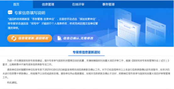 提交至科技部的专家用户,在通过公共服务平台进入专家库时,系统会显示“专家库信息更新通知”。专家用户若确认基本信息、工作领域等信息无需修改,则点击【信息已确认,无需修改】-点击【确认】,系统将显示“信息已确认”;若需要修改,则点击【信息需更新,退回修改】-点击【添加变更申请】,填写变更原因-点击【保存】,进行信息修改。