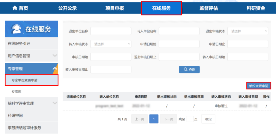 如需修改所在单位,请专家用户登录公共服务平台,点击导航栏【在线服务】-点击左侧列表【专家管理】-点击【专家单位变更申请】-点击页面右侧【单位变更申请】-输入申请加入的单位全称-点击【检索】,检索成功-点击【保存】完成申请(若检索不到需变更的单位,需该单位先在公共服务平台进行注册,注册成功后专家用户可申请加入该单位)。