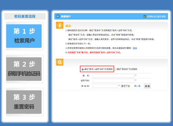 专家用户进入公共服务平台,点击右上角【忘记密码?】-选择【通过“姓名+证件号码”方式找回】-输入姓名、证件号及验证码,点击【检索】-点击【获取手机验证码】-填写验证码-系统发送登录账号及密码到注册手机号,请保持手机通信畅通。