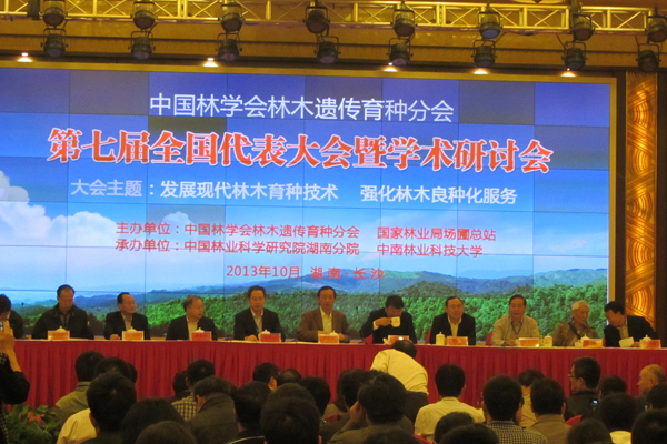 2013年10月20-22日,由中国林学会林木遗传育种分会及国家林业局场圃总站主办,湖南省林科院及中南林业科技大学承办的“第七届全国林木遗传育种代表大会暨学术研讨会”在长沙召开。中国林学会秘书长陈幸良、副秘书长尹发权、国家林业局场圃总站站长杨超、国家林业局科技司副司长杜纪山、湖南省林业厅副厅长唐苗生、东北林业大学校长兼分会主任杨传平等领导出席大会并致辞;来自全国30个省(直辖市、自治区)和美国的林木遗传育种专家学者等正式代表共400多人参加了大会。会议通过了中国林学会林木遗传育种分会第七届委员会委员、东北林业大学校长杨传平连任中国林学会林木遗传育种分会第七届委员会主任委员。