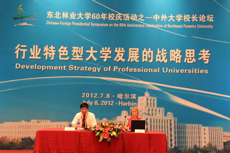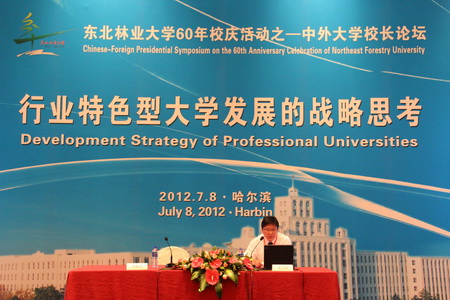 在东北林业大学60周年校庆之际,以“行业特色型大学发展的战略思考”为主题的中外大学校长论坛于7月8日下午3点在香格里拉酒店3号国际会议中心举行。参加会议的有来自世界各地欢庆东林60华诞的国际友人,以及东北林业大学各学院的科研副院长、学术骨干等。会议由副校长赵雨森主持。赵雨森校长阐述了在“创新驱动、转型发展”的时代背景下,行业特色型大学面临着前所未有的机遇和挑战,指出召开此次论坛正当其时。
