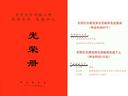 2012年9月24日,全国林业科学技术大会在北京召开,中共中央政治局委员、国务院副总理、全国绿化委员会主任回良玉出席会议。国家林业局局长赵树丛主持会议。会议表彰了为全国林业科技发展做出突出贡献的先进集体和先进个人。我校校长杨传平、科学技术研究院常务副院长李凤日代表学校出席会议。我校林学院、帽儿山实验林场获得“全国林业工作先进集体”荣誉称号;我校副校长赵雨森、森林植物生态学教育部重点实验室主任祖元刚、生态研究中心主任王传宽获得“全国林业科技工作先进个人”荣誉称号。