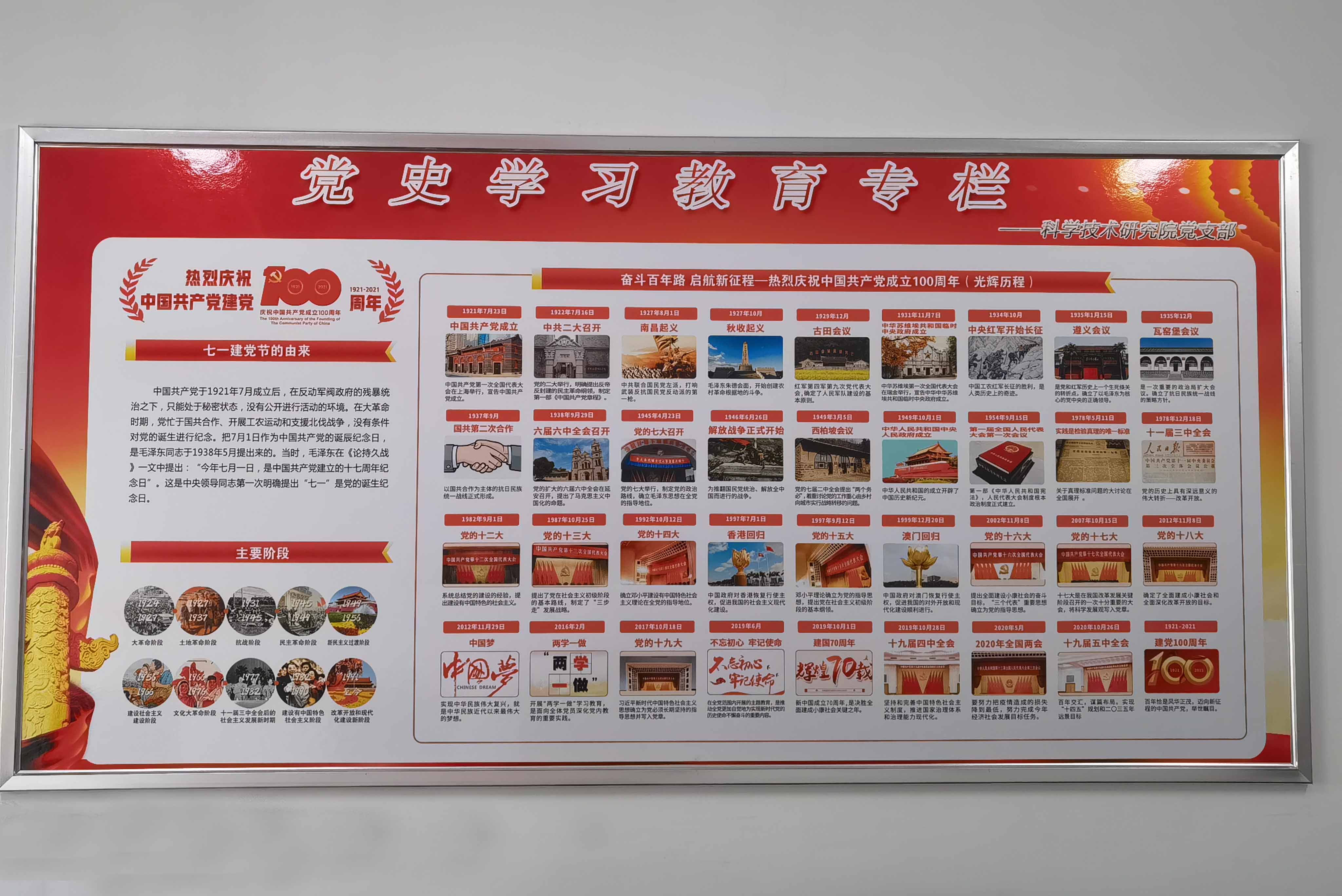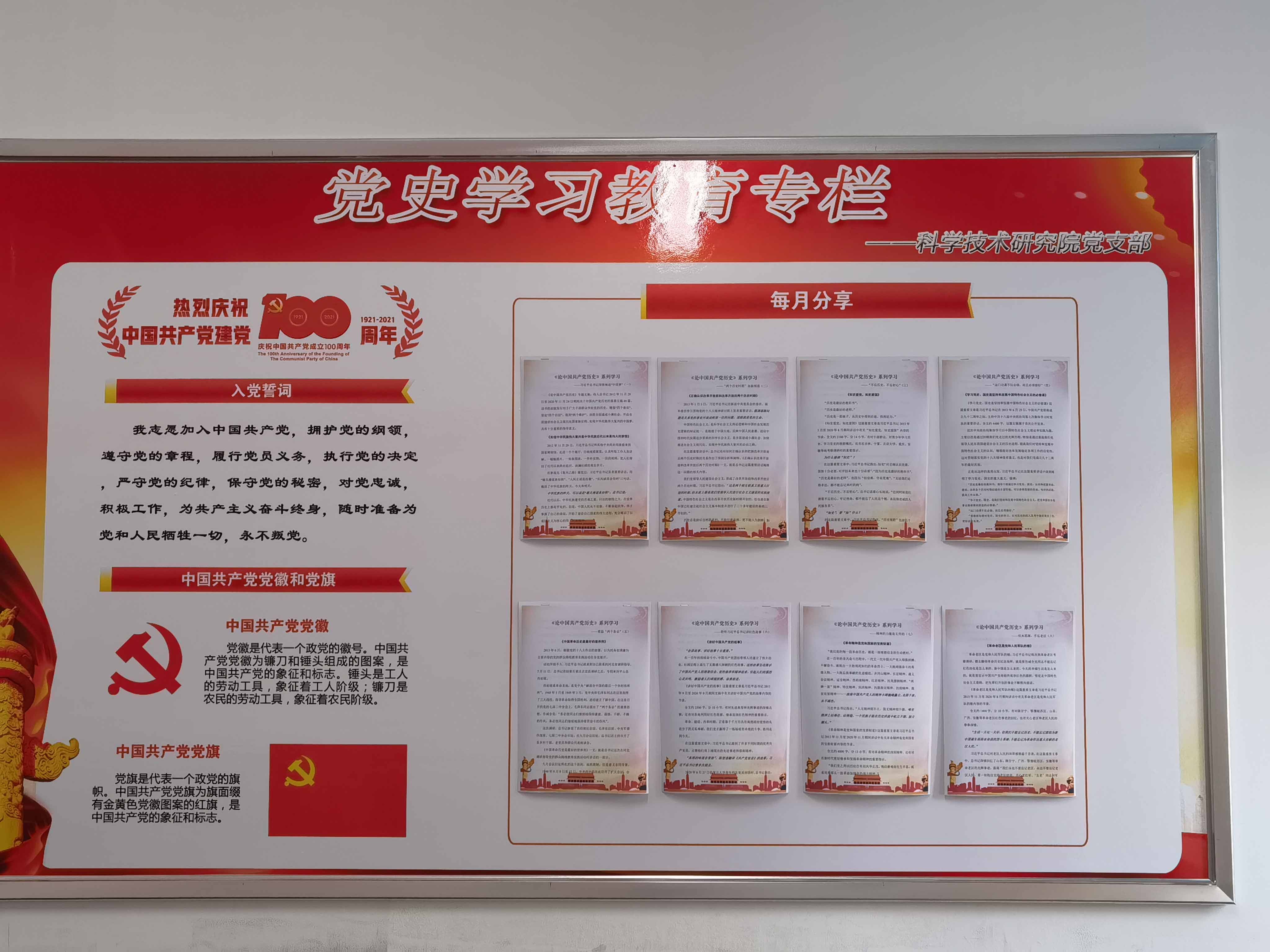 为进一步培养党员干部的爱国之情、强国之志,更好地强化党史学习效果,科学技术研究院党支部将综合办公楼612室布置为“党史学习红色书屋”,并设置了党史学习专栏、每月分享、阅览读书角等,为党员群众开辟了一个随时集聚“红色能量”的地方,营造了浓厚的党史学习教育氛围。