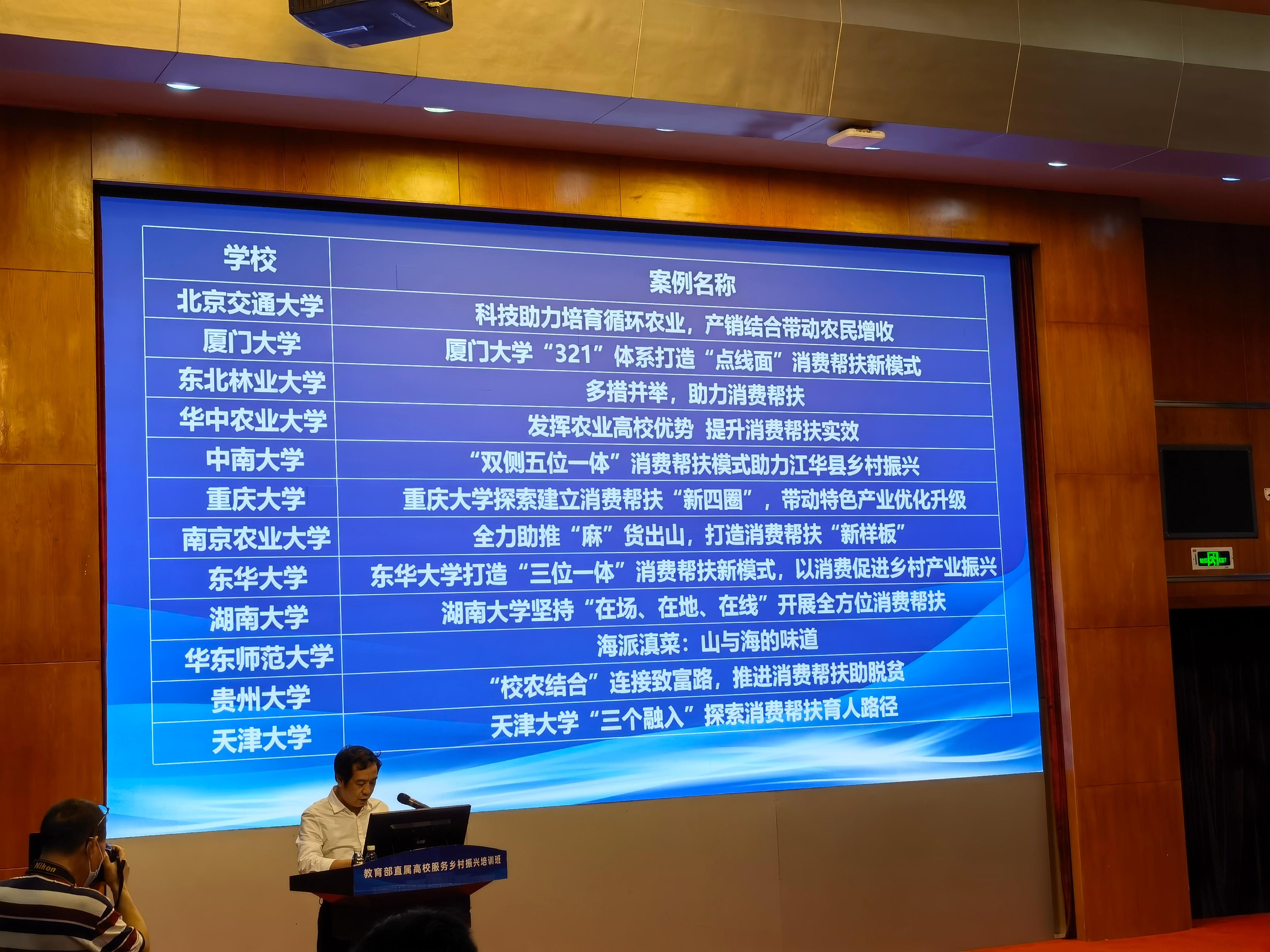 2021年9月14日至9月17日,由教育部发展规划司主办、电子科技大学承办的“教育部直属高校服务乡村振兴培训班”在成都圆满落幕,培训班上公布了第一届“高校消费帮扶典型案例”评选结果。我校“多措并举,助力消费帮扶”案例经过专家组层层评审,成功入选“高校消费帮扶典型案例”,在教育部直属75所高校中仅有12所高校案例成功入选。